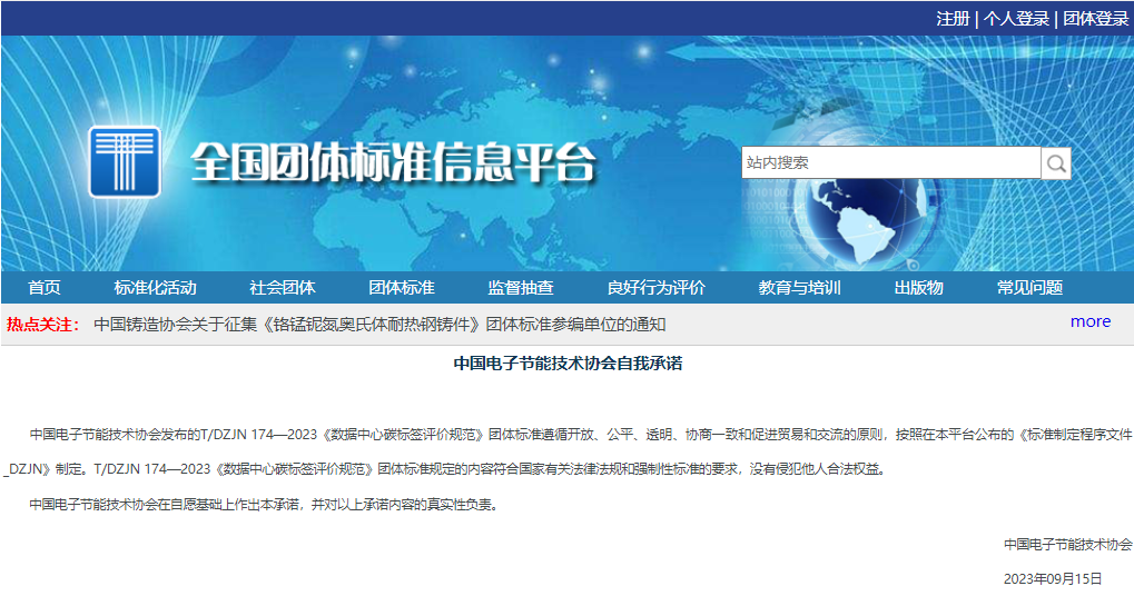 由华为技术有限公司牵头,国网、中国电信、中兴通讯、百度、腾讯云、阿里云等众多公司参与,中标华信(北京)认证中心有限公司作为起草单位,参与编写的T/DZJN 174—2023《数据中心碳标签评价规范》、T/DZJN 175—2023《数据中心碳排放控制规范》两项团体标准正式发布。